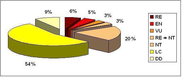 ugrožene vrste (rizične VU, ugrožene EN, kritično ugrožene vrste CR), kojima se pribrajaju i nedovoljno poznate vjerojatno ugrožene vrste (DD), za koje nedostaje podataka na temelju kojih bi se mogla utvrditi njihova stvarna kategorija ugroženosti;
